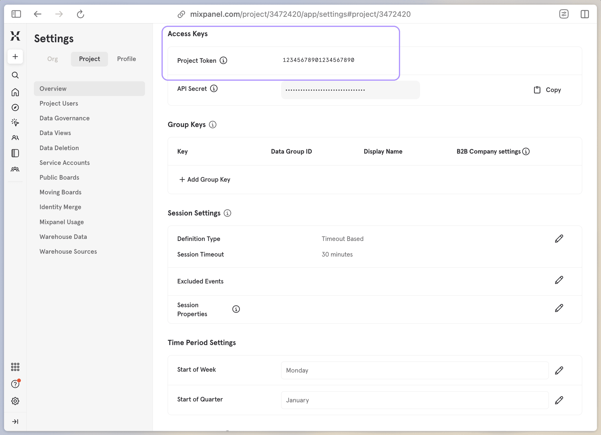 Go to your Mixpanel Dashboard > Project Settings and copy your Project Token under Access Keys